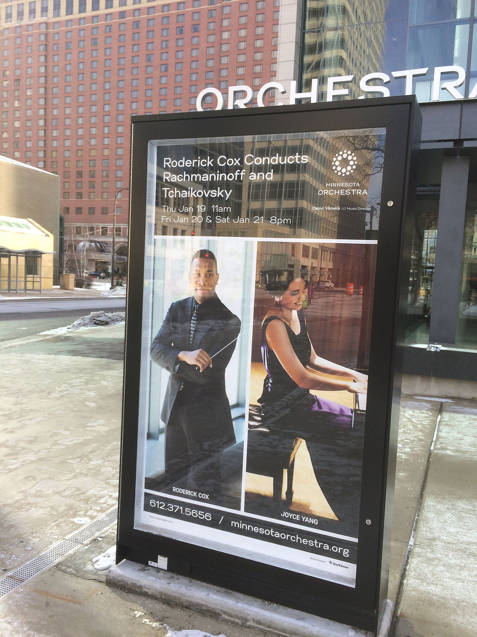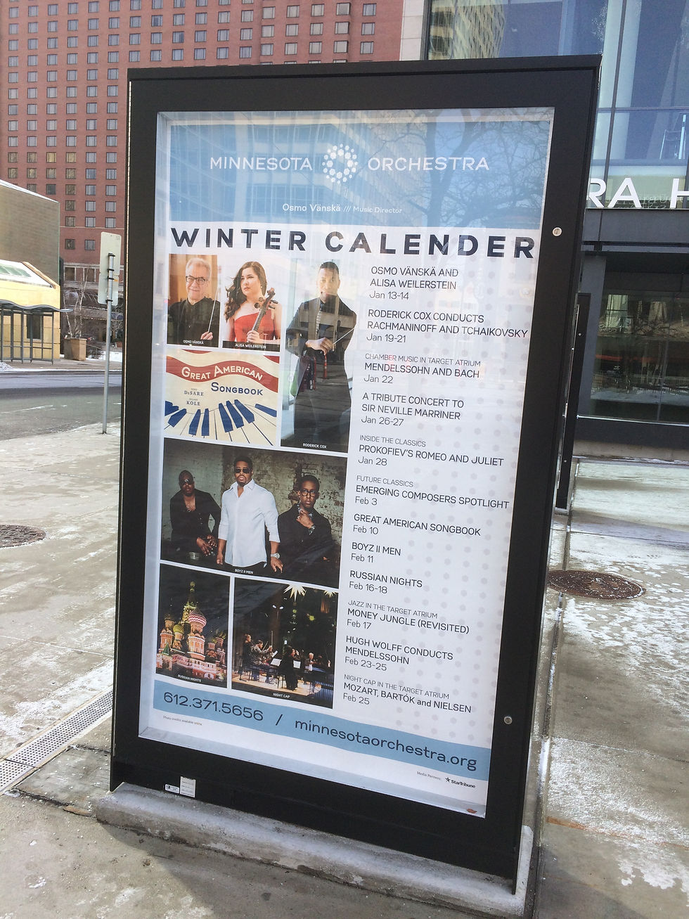 I get to design a lot of cool collateral for the Minnesota Orchestra. Designing the signage for Orchestra Hall is a fun part of my job. When we rebranded, I had the opportunity to work with the local agency who produced the signage and brainstorm and help design lobby and Hall signage. It was a great chance to work in 3-D and think about the environment that the patrons would be experiencing this in. We kept it simple and clean and bold. I think it's quite striking and stays true to our Minnesota Scandinavian roots.